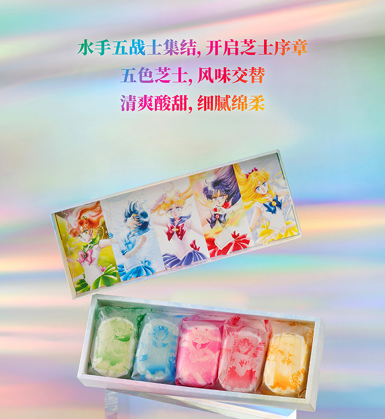 Ban Shu Zhi Shi - zestaw serniczków z nadzieniem; w opakowaniu znajduje się pięć sztuk po 36 g (razem 180 g); każdy kawałek inspirowany jest inną inner senshi; Sailor Moon jest o smaku malinowo-różanym; Sailor Mercury jest o smaku kokosowo-ananasowym; Sailor Mars jest o smaku waniliowo-truskawkowym; Sailor Jupiter jest o smaku jaśminowo-jogurtowym; a Sailor Venus jest o smaku miodowo-jogurtowym; w opakowaniach znajdują się karty kolekcjonerskie o wymiarach 85 x 60 mm; do uzbierania jest 6 wzorów: z inner senshi i Księżniczką Serenity; 12 yuanów za opakowanie (ok. 7 zł); sprzedawane również w sklepie internetowym Holiland.