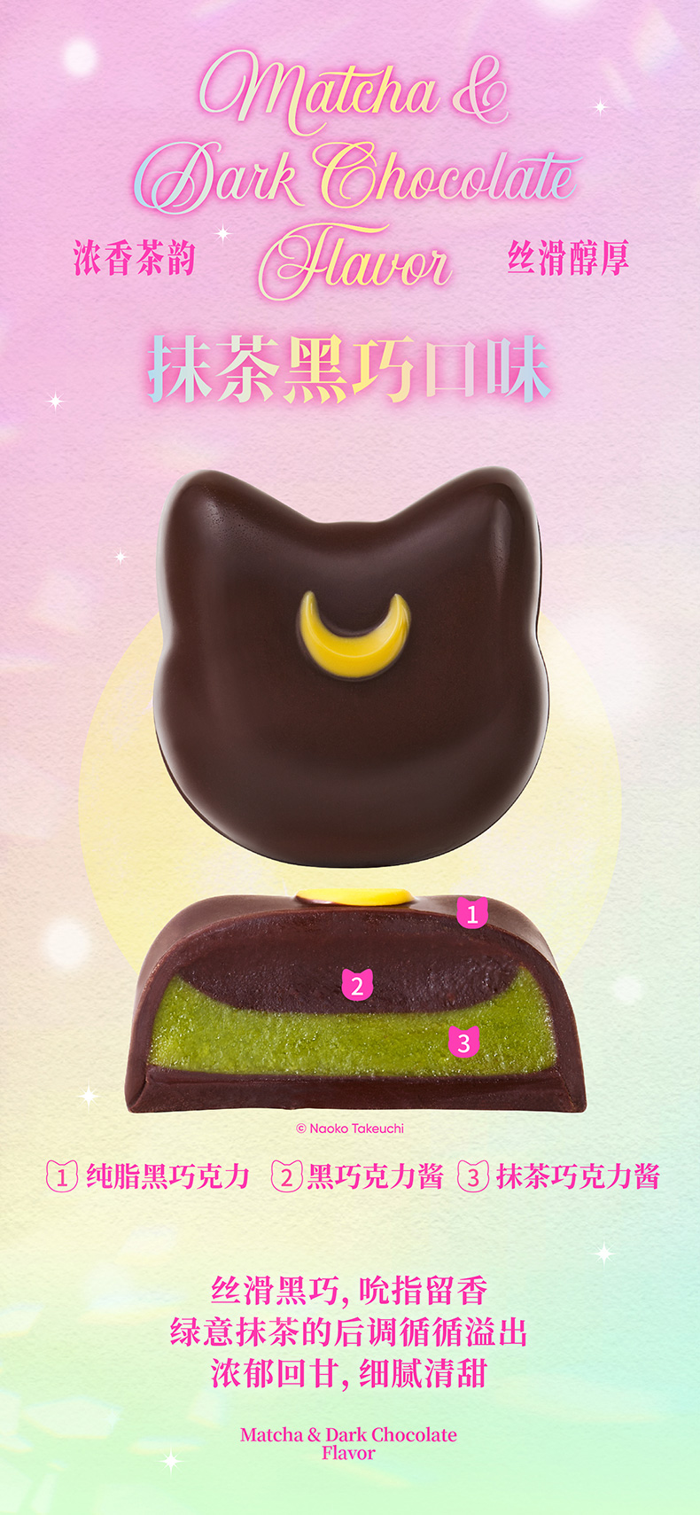 Luna Chocolate - czekoladki w kształcie głowy Luny z półksiężycem na czole; w opakowaniu znajduje się 6 czekoladek o wadze 12 g; czekoladki są o smaku czekoladowym-matcha w polewie z ciemnej czekolady; wymiary jednej sztuki to 35,6 x 35,2 mm; przykryte są bibułką z nadrukiem strony z mangi; 12 yuanów za opakowanie (ok. 7 zł); sprzedawane również w sklepie internetowym Holiland.