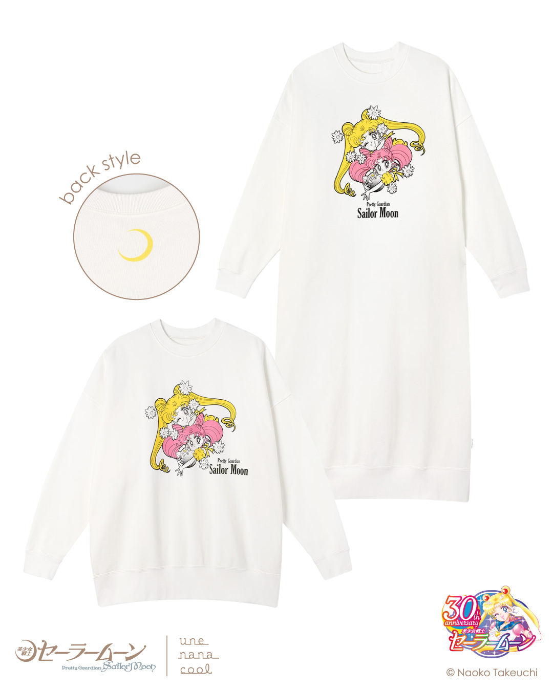 do wyboru różowa z Eternal Sailor Moon i biała z Usagi i Chibiusą; rozmiar w okolicach M-L (długość 116 cm, obwód w biuście 136 cm); 11 000 jenów (ok. 253 zł) za sztukę.