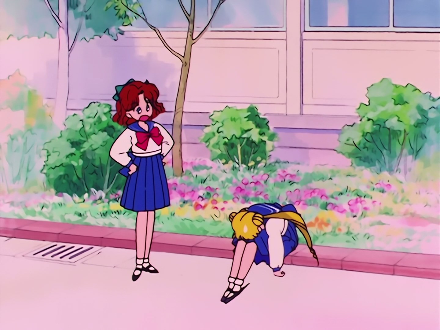 Usagi i tak spóźnia się do szkoły i nauczycielka za karę wystawia ją za drzwi. Usagi jest głodna i burczy jej w brzuchu, rozgląda się dookoła, wyjmuje pudełko z drugim śniadaniem i zaczyna jeść. Nauczycielka