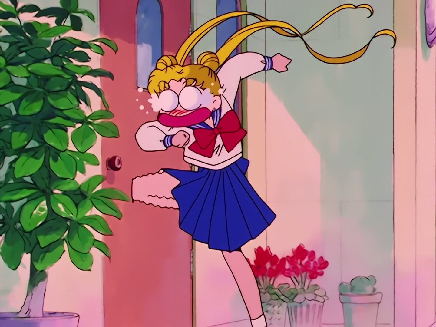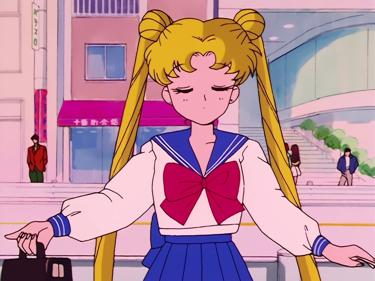 Usagi śpi spokojnie w swoim łóżku, a my słyszymy narrację jej własnym głosem o tym, kim jest. Jej mama informuje ją, że jest już po ósmej i powinna wstać. Usagi z przerażeniem spogląda na swój budzik i krzyczy. Zbiega po schodach, myje zęby i pyta się