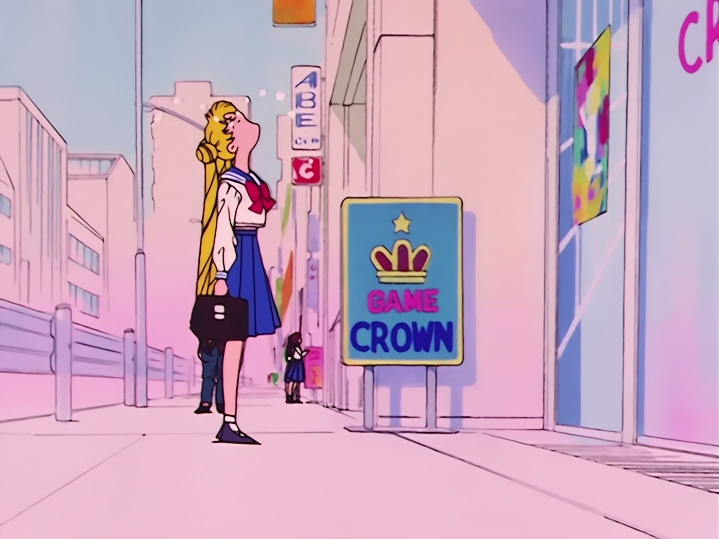 Usagi wracając do domu, przechodzi koło salonu Crown i widzi w oknie plakat gry Sailor V. Przystaje
