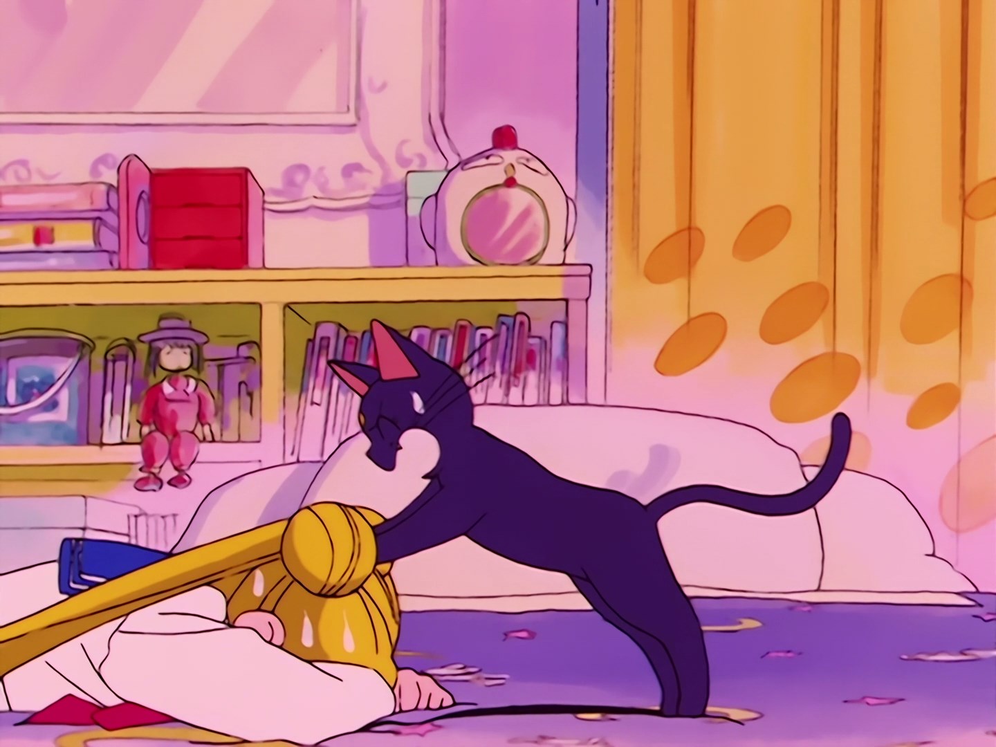 Usagi leży na łóżku i jest zmęczona płaczem. Postanawia na razie nie odrobić pracy domowej, ale się zdrzemnąć. Okno w jej pokoju otwiera się i wchodzi przez nie do środka czarna kotka. Usagi ogląda się za siebie i spostrzega kota,