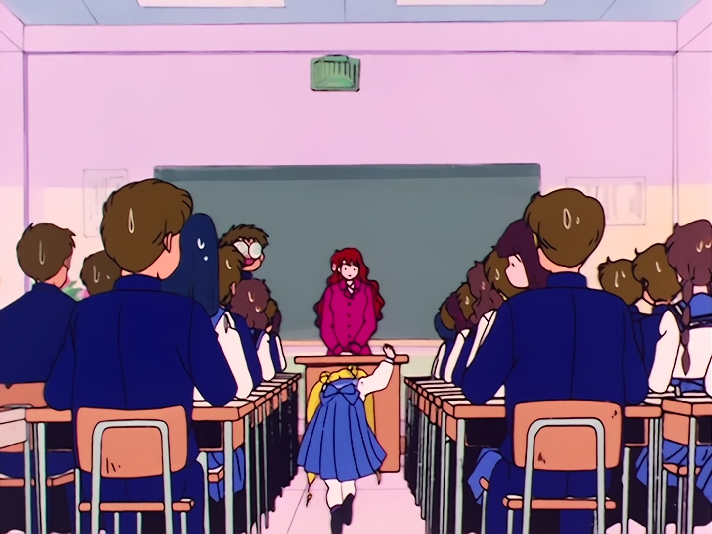 W klasie w gimnazjum Juuban nauczycielka, pani Sakurada, czyta listę obecności. Usagi próbuje się zakraść na swoje miejsce niepostrzeżenie, ale zdradza ją Umino krzycząc głośno dzień dobry. Nauczycielka zdenerwowana jej zachowaniem