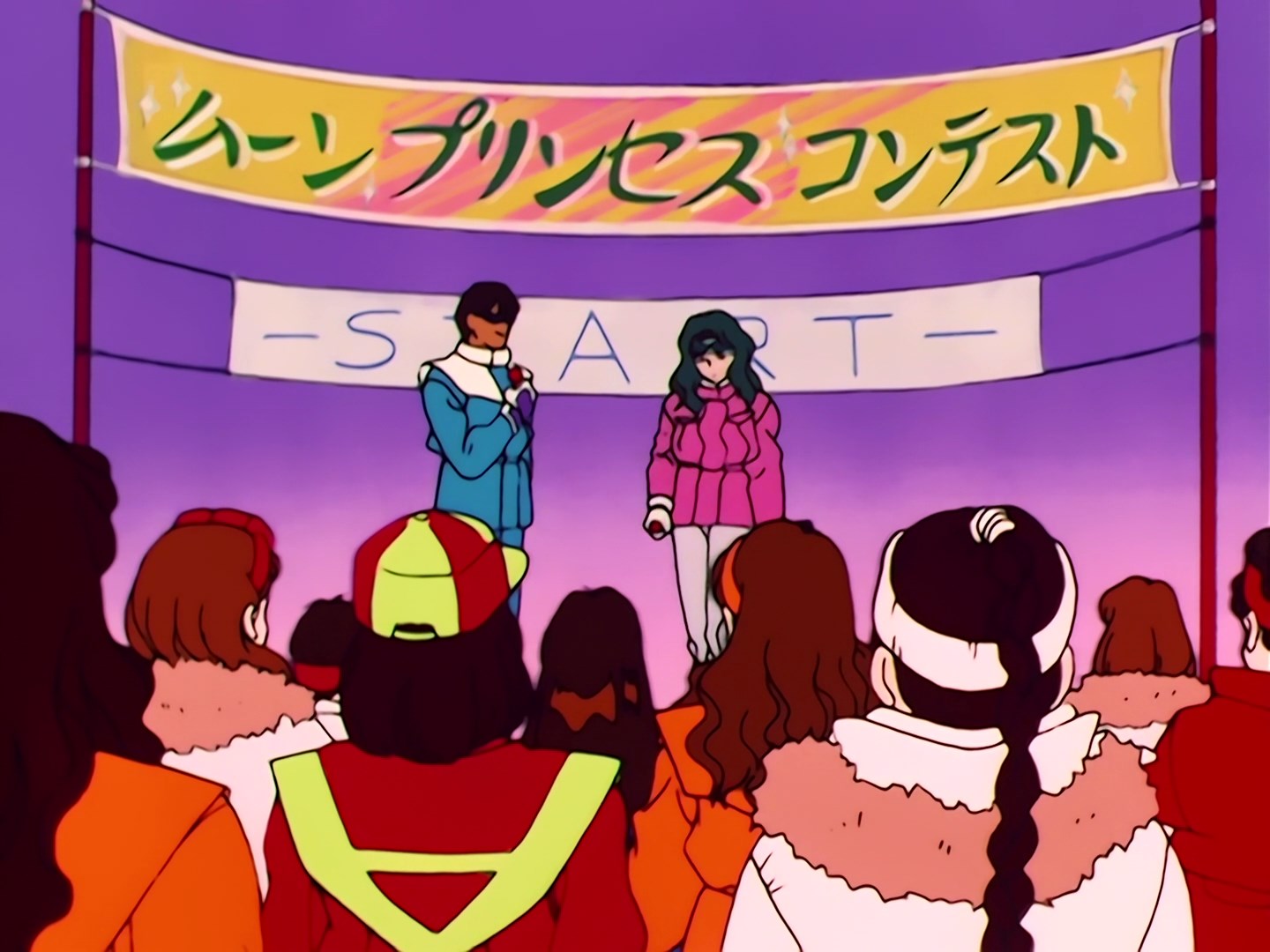 w kilku rzędach startują z linii startu. Rei również bierze udział w konkursie. Wszystkie dziewczyny już wystartowały i na starcie została jedynie Usagi, która boi się ruszyć. Yuuichirou dodaję jej otuchy, a następnie popycha ją do