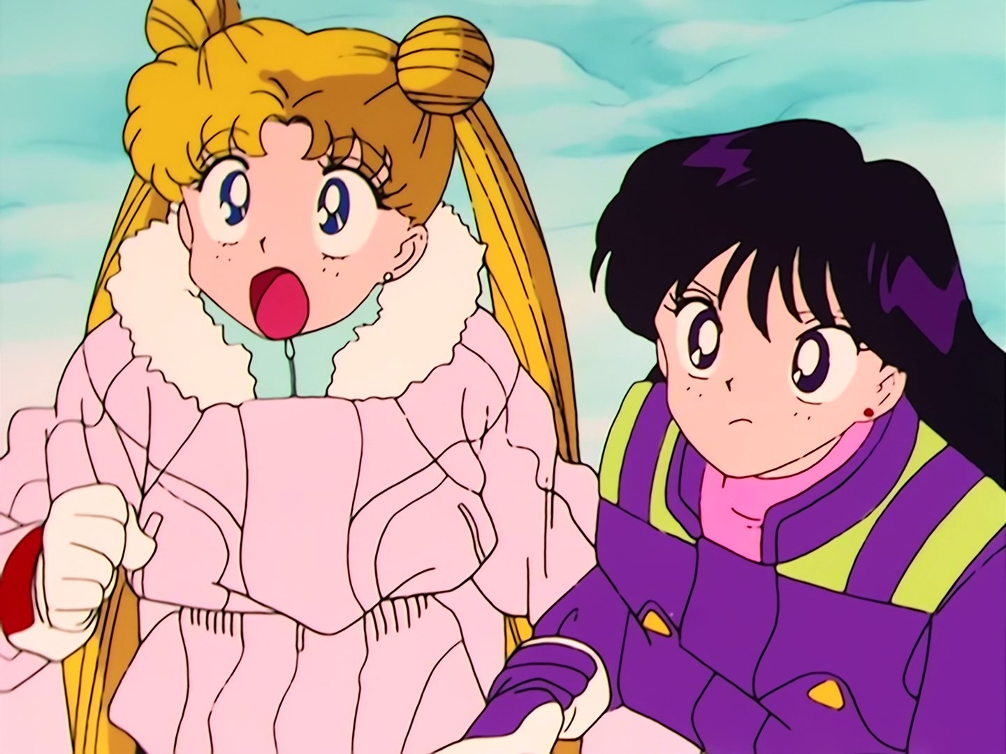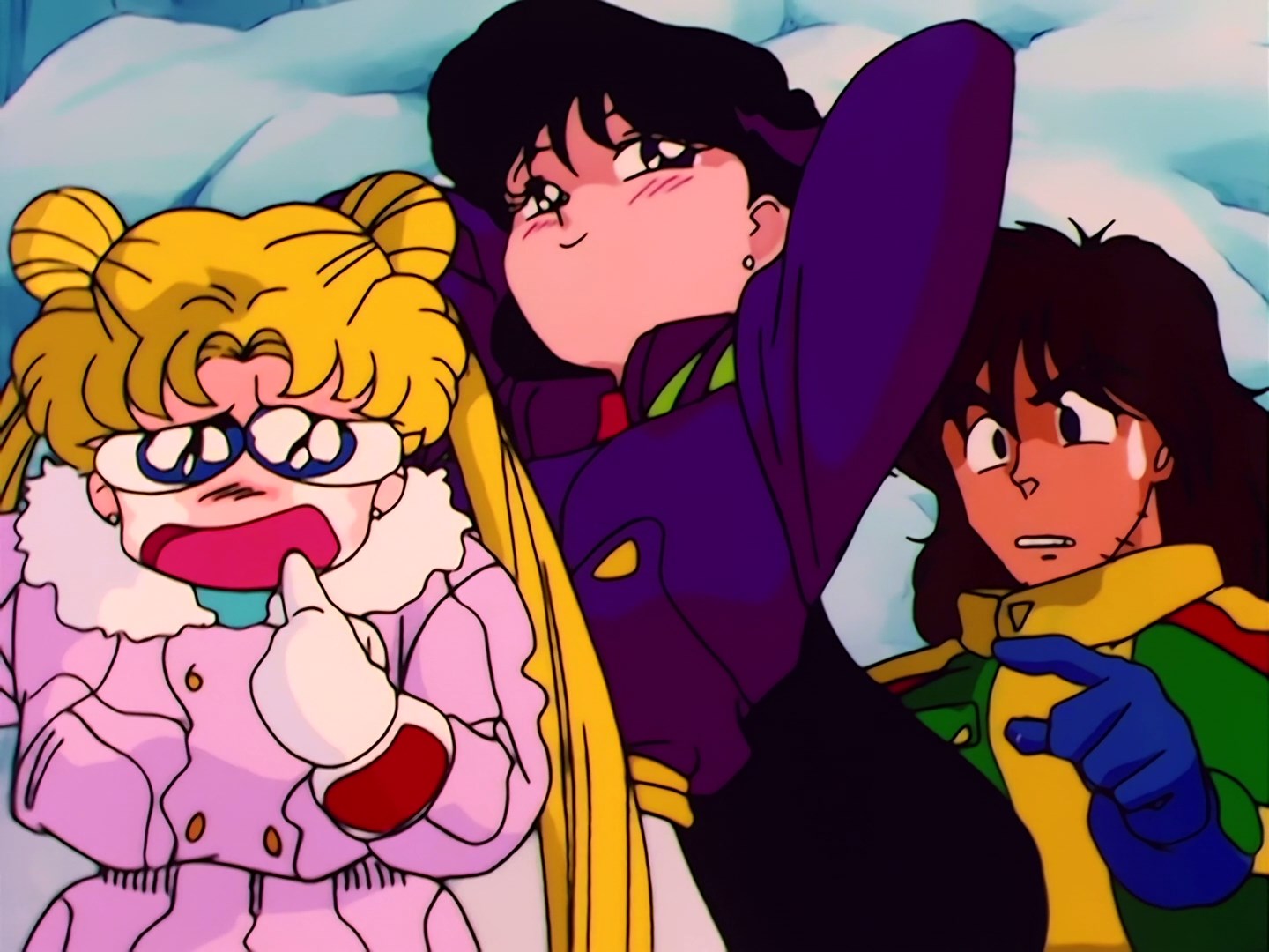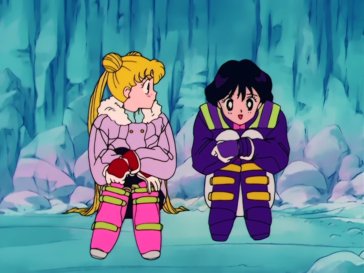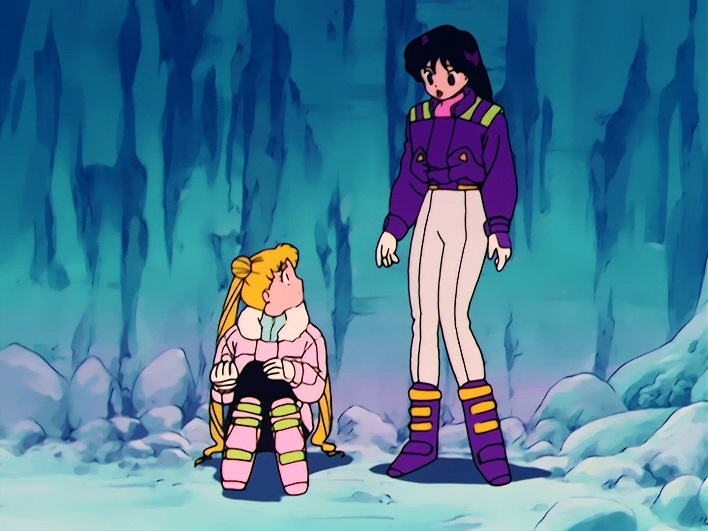 ją i obie przewracają się zatrzymując się w ten sposób. Obie zostają uwięzione w wąskiej szczelinie między ścianami. Rei próbuje się wydostać wspinając się po śniegu, ale nie specjalnie jej to wychodzi. Jest przy tym zła na Usagi,
