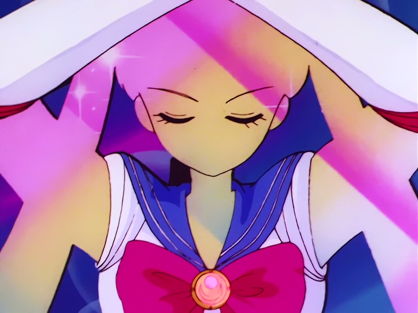 Poświaty. Sailor Moon żali się teraz swoim koleżankom, że jej Diadem przestał działać. Pozostałe wojowniczki pocieszają ją, ale Luna wydaje się być zaniepokojona tym faktem. Sailor Venus i Sailor Jupiter używają ataków Crescent Beam