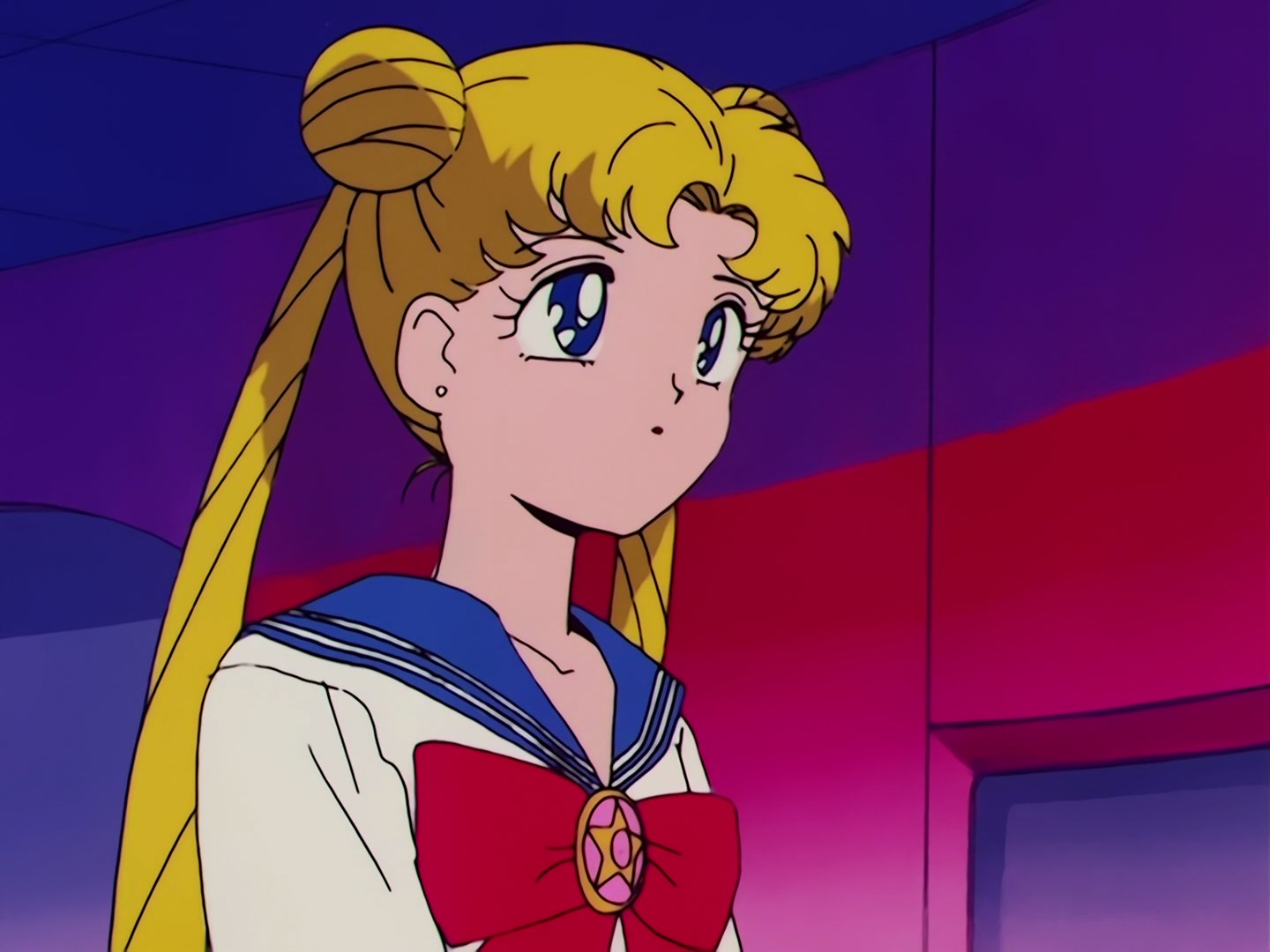 Usagi z Luną znajdują się przed budynkiem, na którym znajduje się transparent informujący o przedstawieniu opowiadającym o Sailor Moon. Usagi jest zadowolona, że jej alter ego jest aż tak sławne, ale Luna komentuje ironicznie,