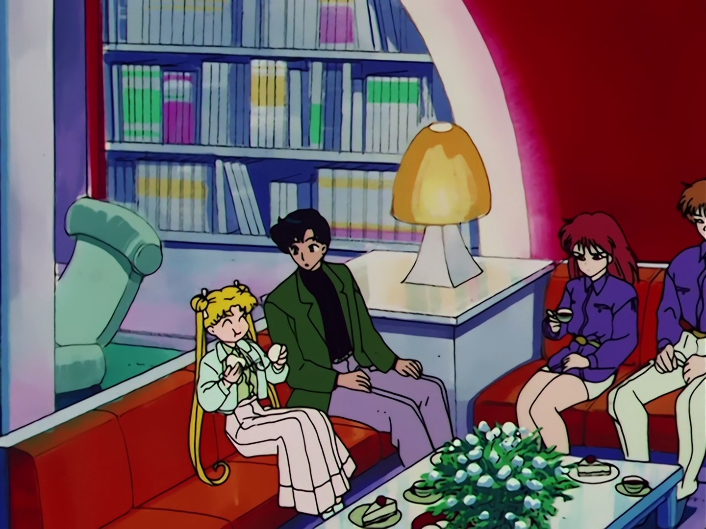 Wszyscy siedzą na kanapie i piją herbatę, a Usagi napycha się ciastem. W międzyczasie Natsumi zastanawia się, jak zwabić Usagi do pokoju, w którym znajduje się Makaiju. Mamoru zauważa, że mają piękny widok na miasto z balkonu.