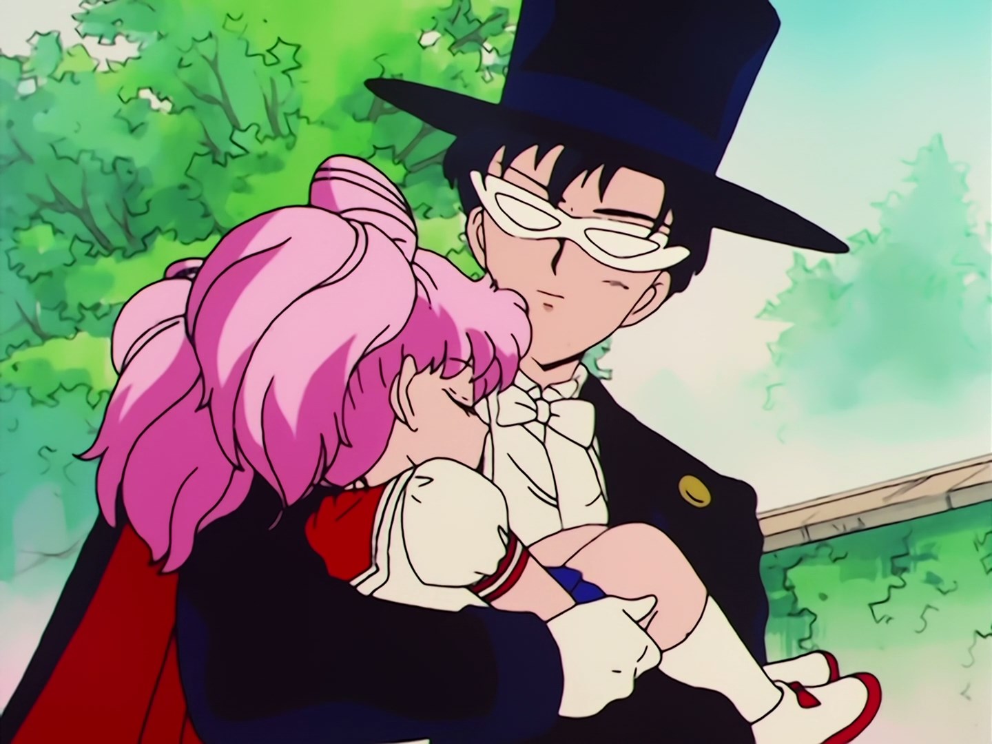 tak niefortunny, że dziewczyna nokautuje Usagi i jednocześnie trafia swoimi ustami w usta Mamoru. Poturbowana Usagi podnosi się i widzi swojego chłopaka, na którego szyi uwieszona jest mała dziewczynka z różowymi włosami. Usagi jest