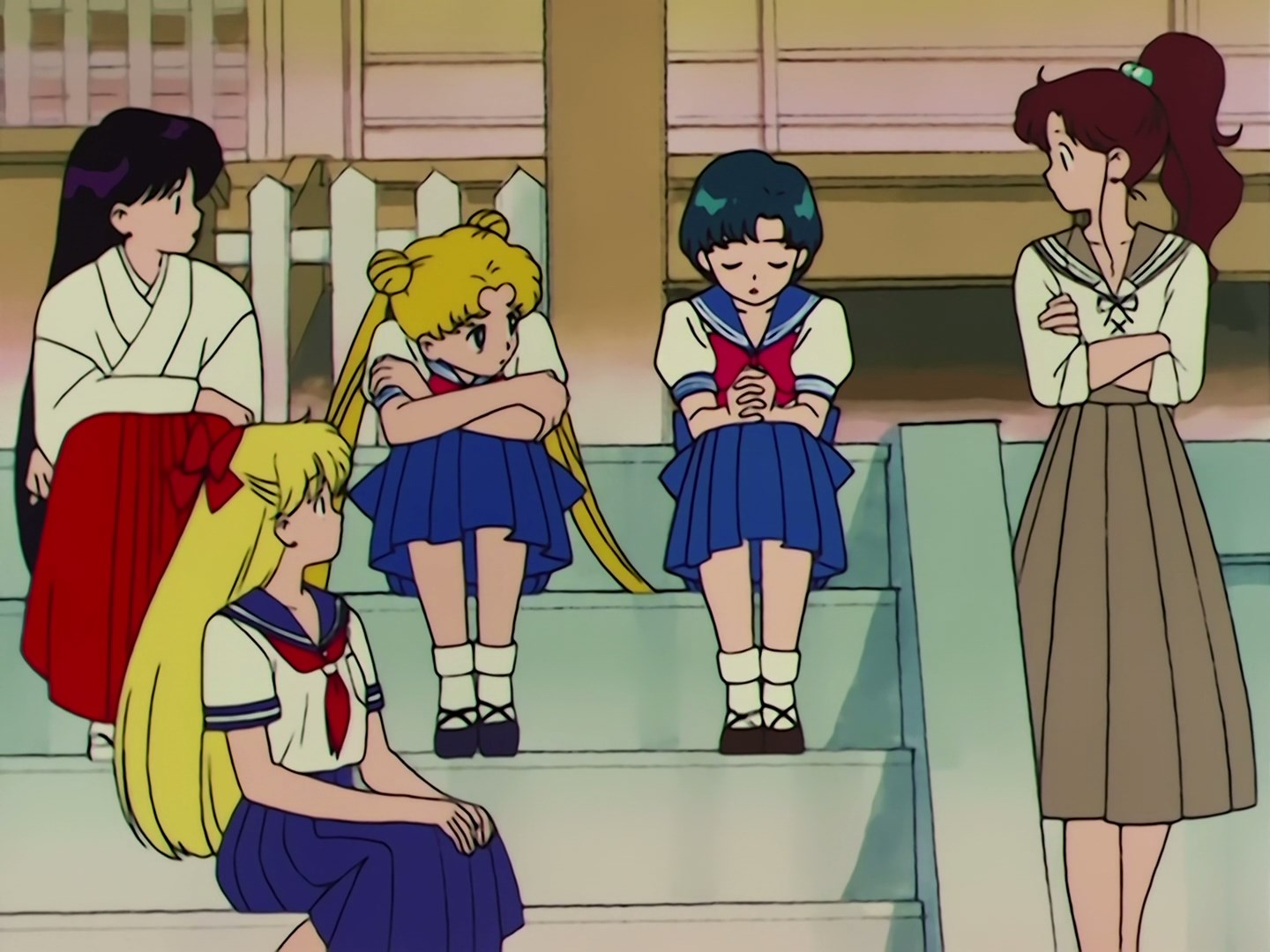 Dziewczyny siedzą na schodach Świątyni Hikawa i rozmawiają o zerwaniu między Usagi i Mamoru. Rei pyta się o powód, ale Usagi nie jest w stanie wyjaśnić jego zachowania. Minako dodaje, że to pewnie nic takiego i Mamoru powiedział