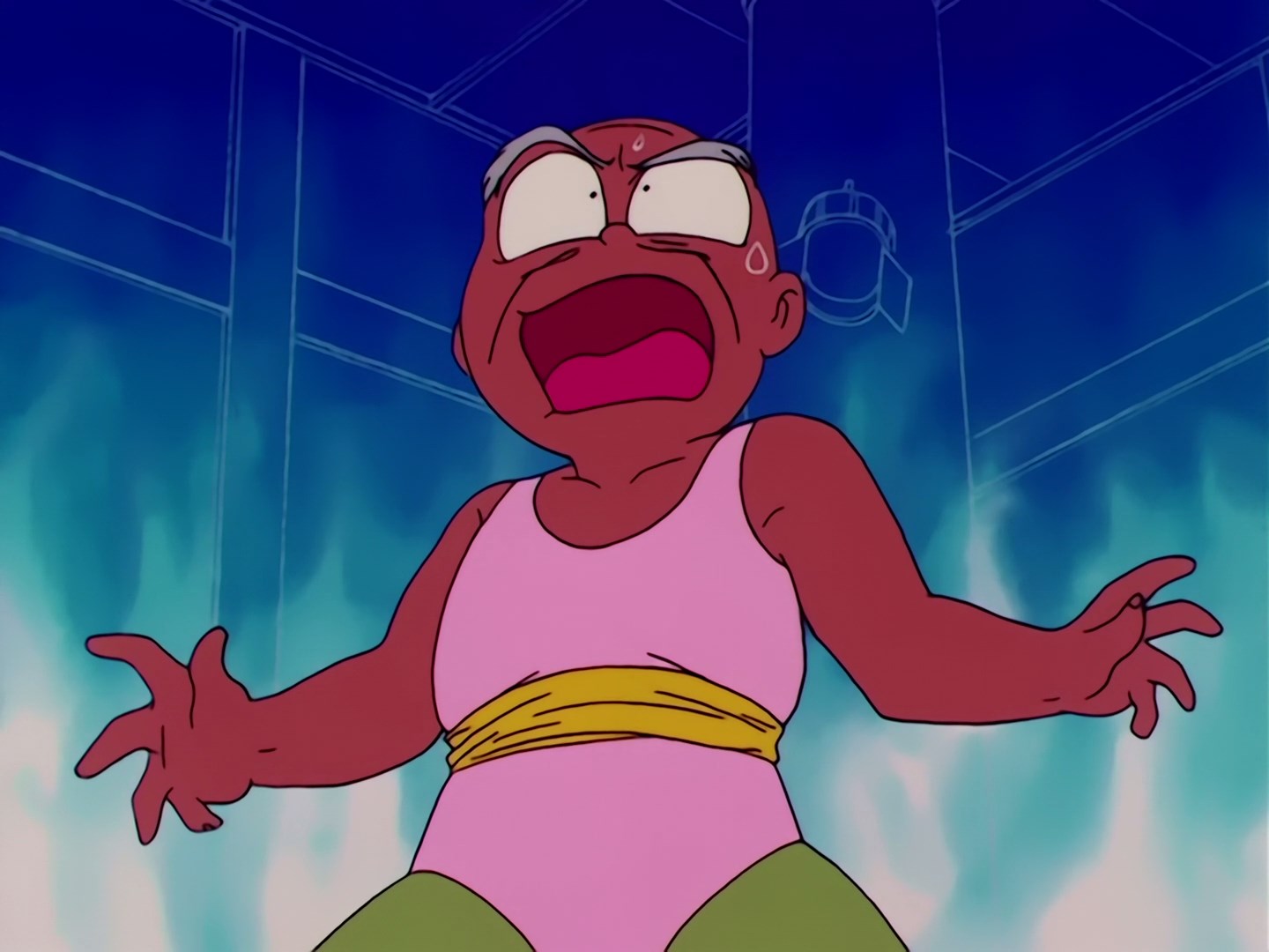 się, co to za dziwny sport, a Rei odpowiada, że jej dziadek nazywa to połączeniem technik samoobrony i aerobiku. Rei zauważa, że takie rzeczy nie powinny się dziać w Świątyni, kiedy nagle drzwi Salonu Samoobrony otwierają się i temu,