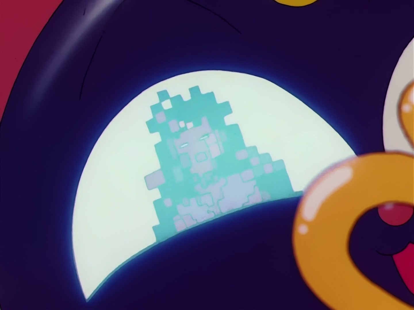 Chibiusa chowa się przed deszczem we wnęce budynku dokładnie pod piętrem kawiarni, w której znajdują się cztery dziewczyny. Dziewczynka naciska nos Luny P, po czym jedno oko zabawki zamienia się w ekran, na którym pojawia się