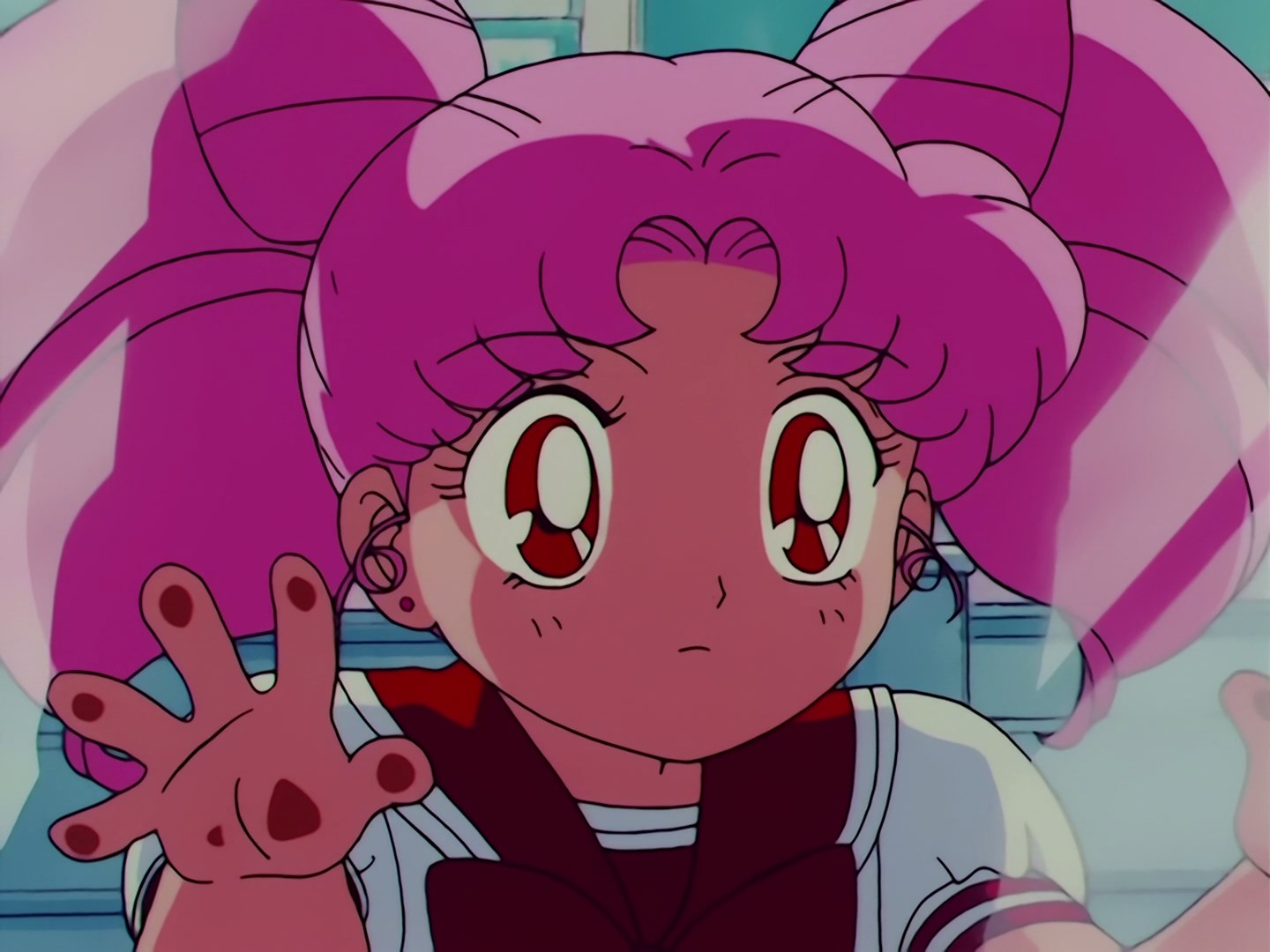 z proszku gaśniczego. Dziewczyny wykorzystują to, że wróg ich nie widzi i chowają się. Usagi trzyma Chibiusę, podchodzi do niej Luna i wskazuje jej wyjście z pokoju. Mako i Minako w innej części pokoju pod osłoną pyłu z gaśnicy przemieniają