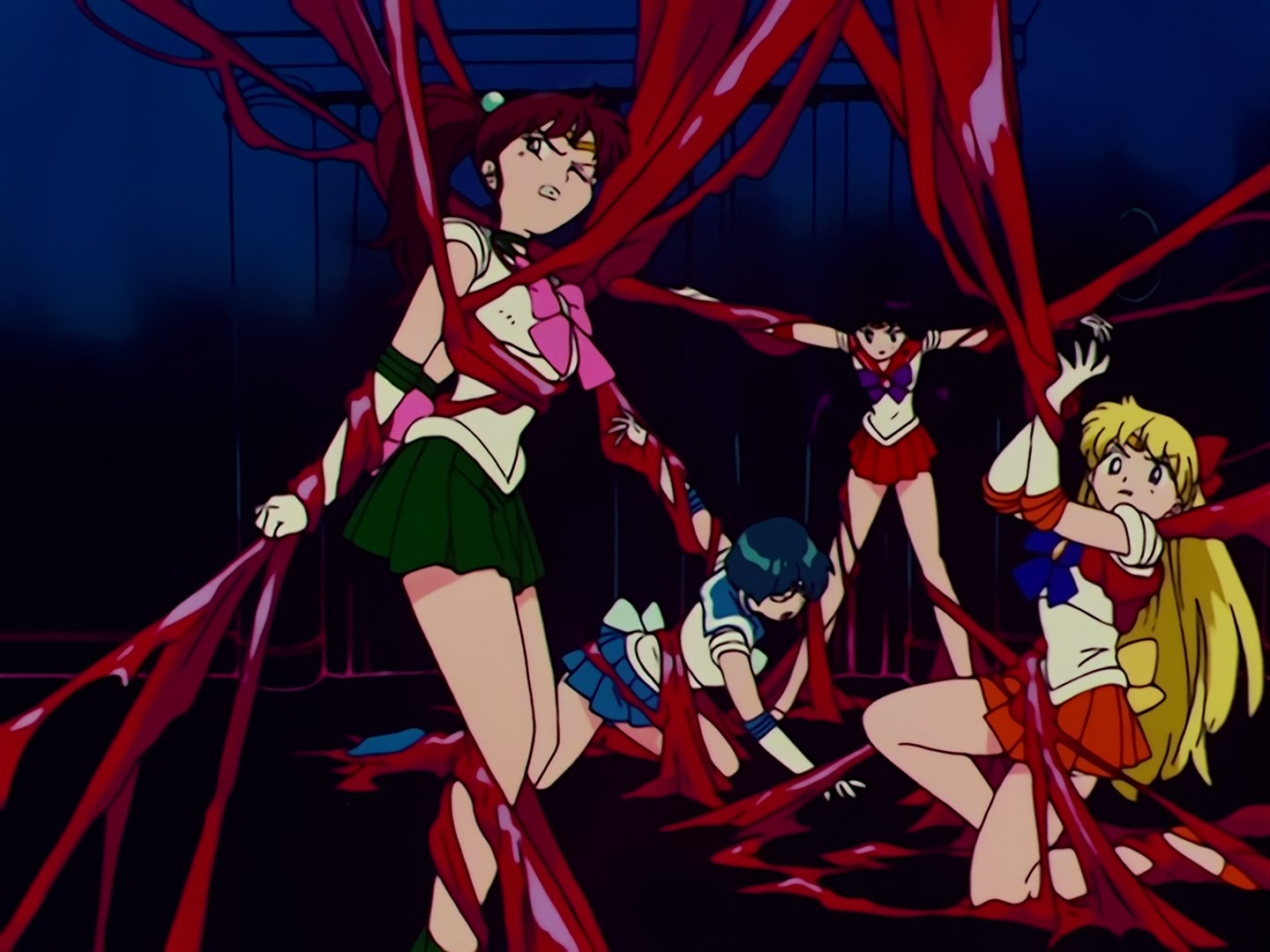 Cztery wojowniczki mają problem z pokonaniem Droida i wszystkie zostają uwięzione w czerwonej mazi. Do pomieszczenia wchodzi Sailor Moon i jest zaskoczona obecnością Sailor Mercury i Sailor Mars. Sailor Mars pospiesza ją, aby