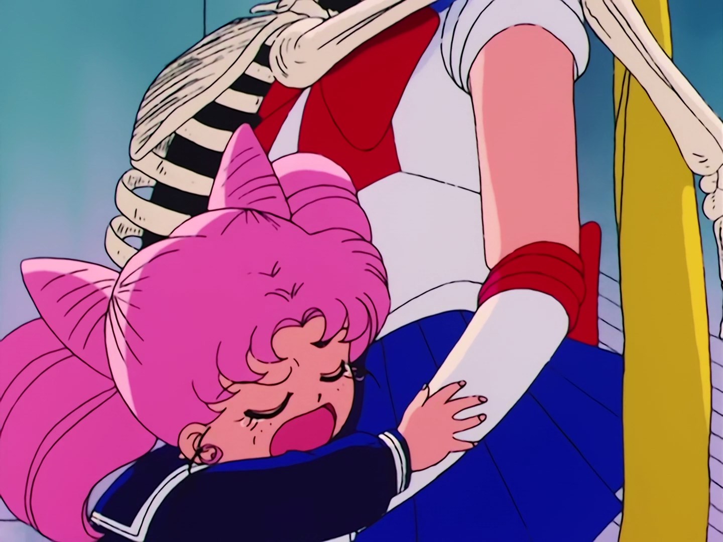 wyszła z ukrycia. Nagle ktoś wypowiada imię wojowniczki, a stojący obok niej szkielet zaczyna się ruszać. Sailor Moon jest przerażona, ale okazuje się, że za szkieletem schowana była Chibiusa. Dziewczynka z przerażenia obejmuje jej