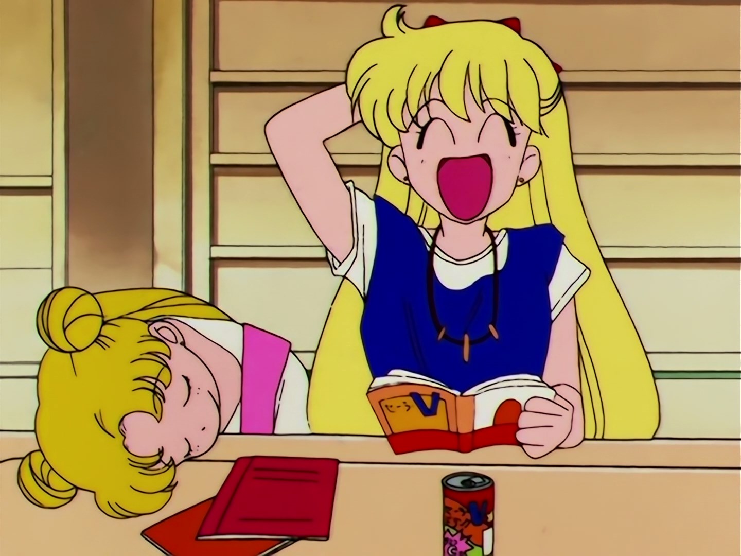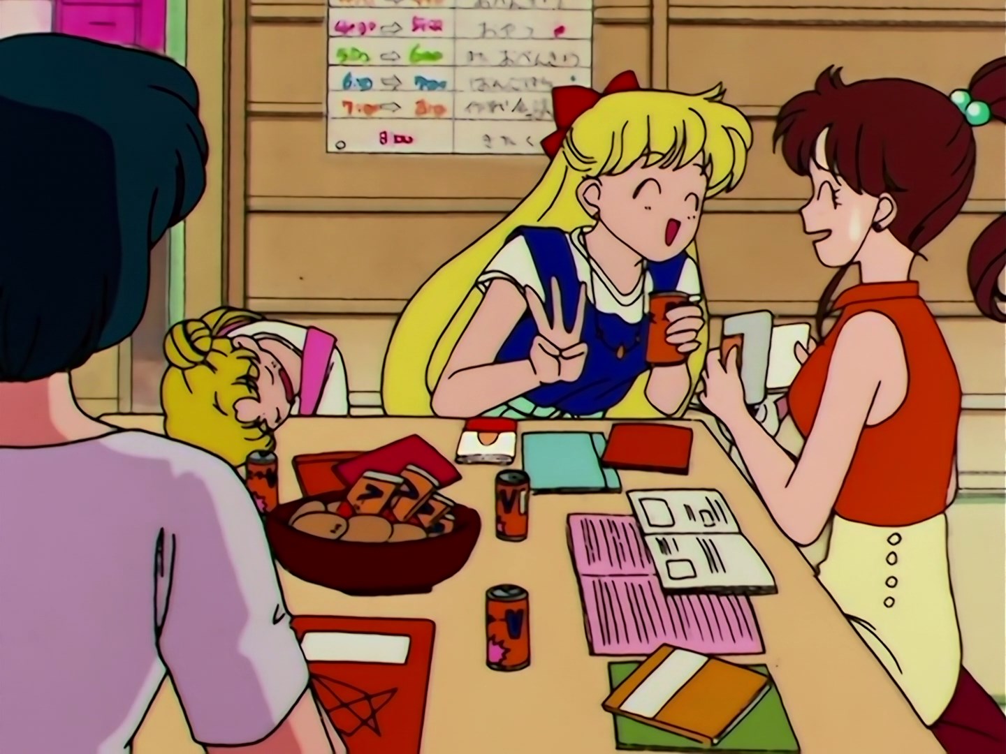 Dziewczyny siedzą w Świątyni Hikawa i spędzają czas na nauce w pokoju Rei. Wszystkie siedzą w ciszy, ale Minako czyta mangę i śmieje się do rozpuku. Obok niej siedzi Usagi, która zdążyła usnąć z głową na stoliku. Minako trzyma