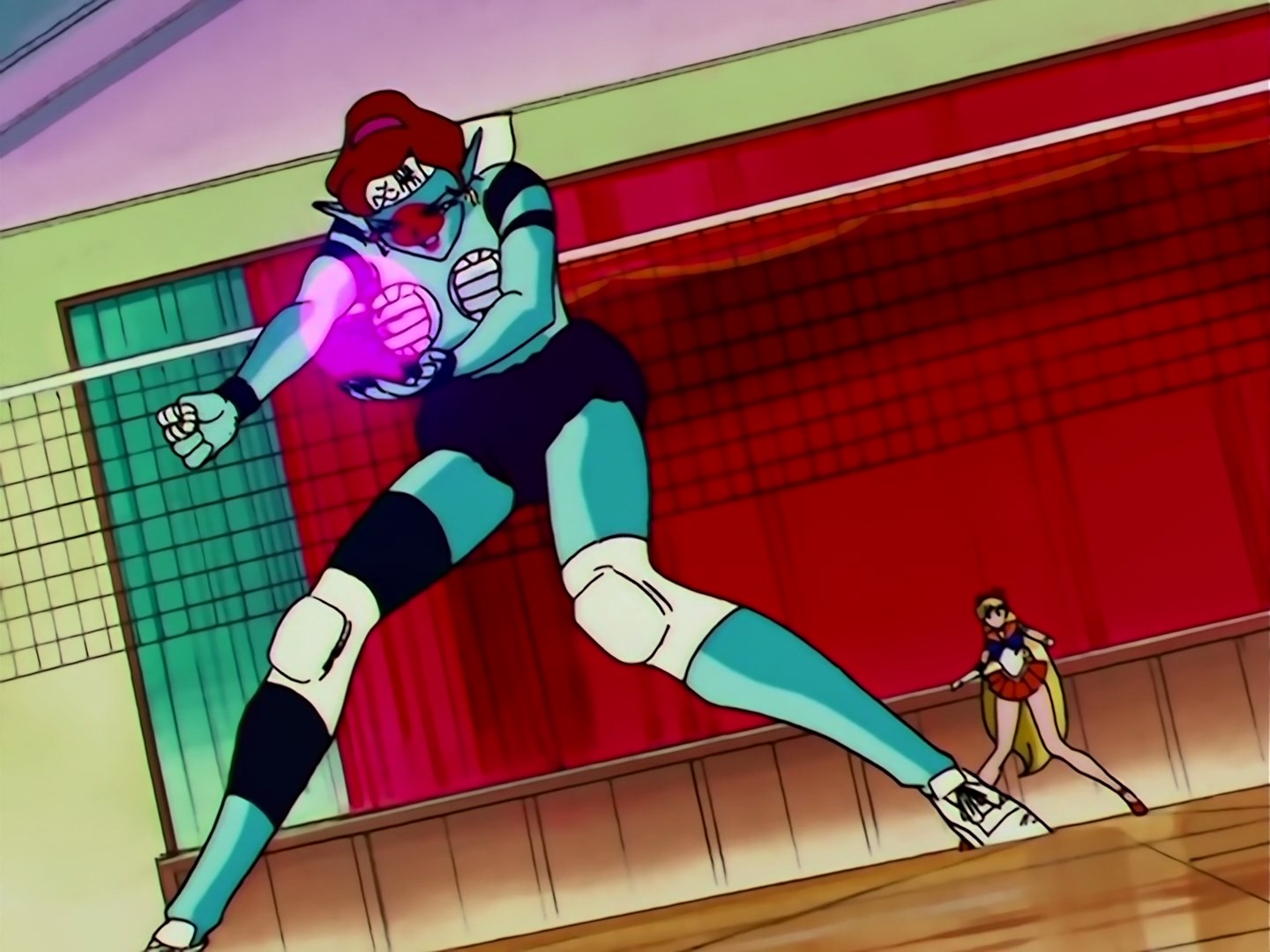 w sali gimnastycznej, wygłasza przemowę. Daimon również w nią celuje piłką, a ona niszczy ją za pomocą ataku Venus Love Me Chain. Niespodziewanie Daimon owija wojowniczkę świecącą siatką. Sailor Venus przewraca się na podłogę i próbuje