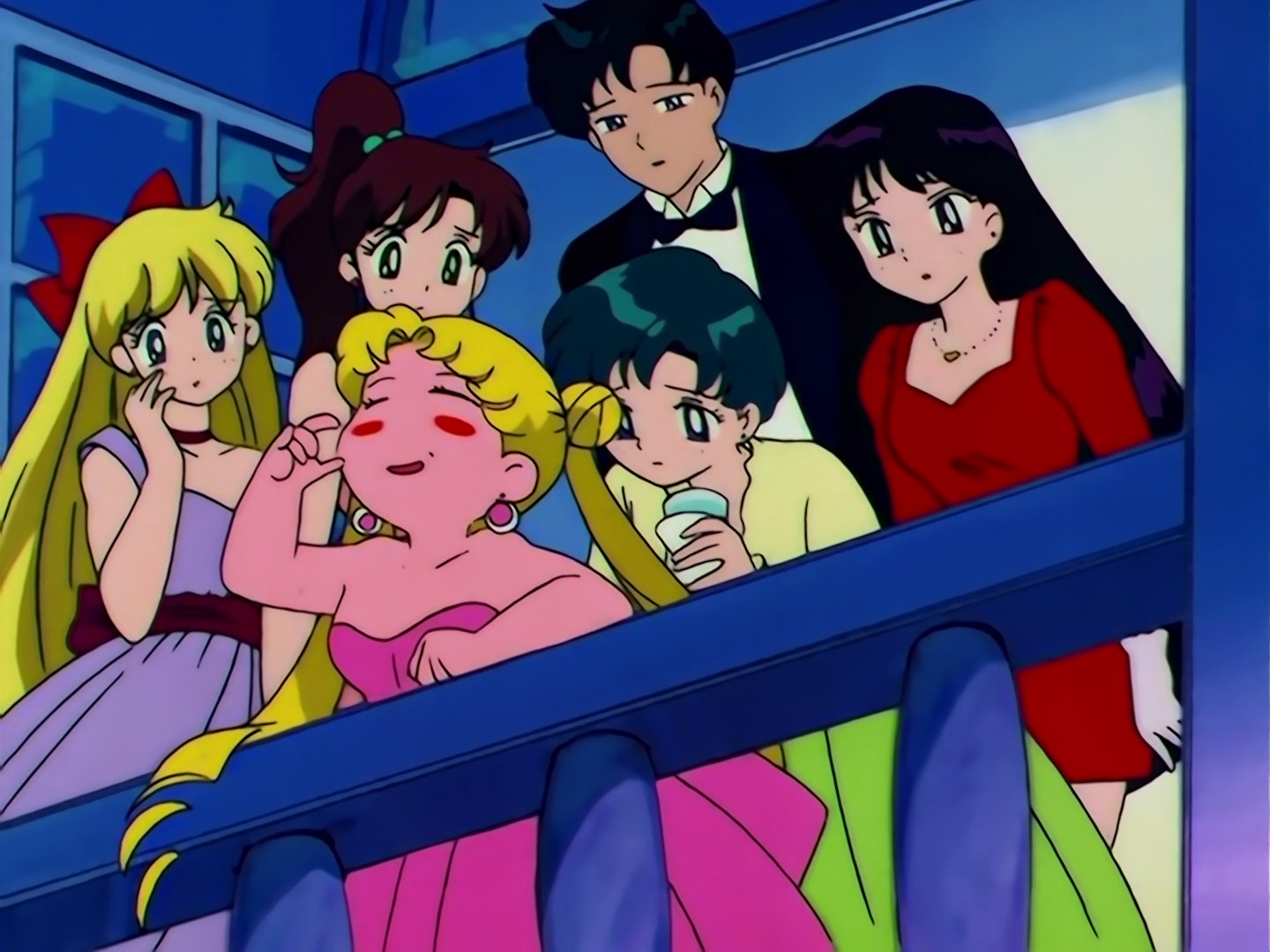 Usagi jest teraz przewieszona przez barierkę balkonu, a dziewczyny pytają się jej, dlaczego piła alkohol. Usagi odpowiada, że nie piła alkoholu, a jedynie sok. Chwilę później dziewczynie kręci się w głowie, a przyjaciółki bardzo