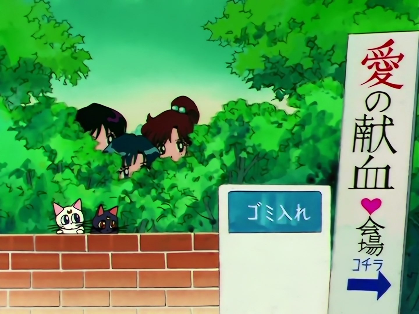 samochód, który powiadamia przechodniów o możliwości oddania krwi. Minako natychmiast wybiega z księgarni, a Haruka mówi do Michiru, że przez chwilę podejrzewała Minako o to, że coś wie na temat Talizmanów. Obie dziewczyny zamierzają