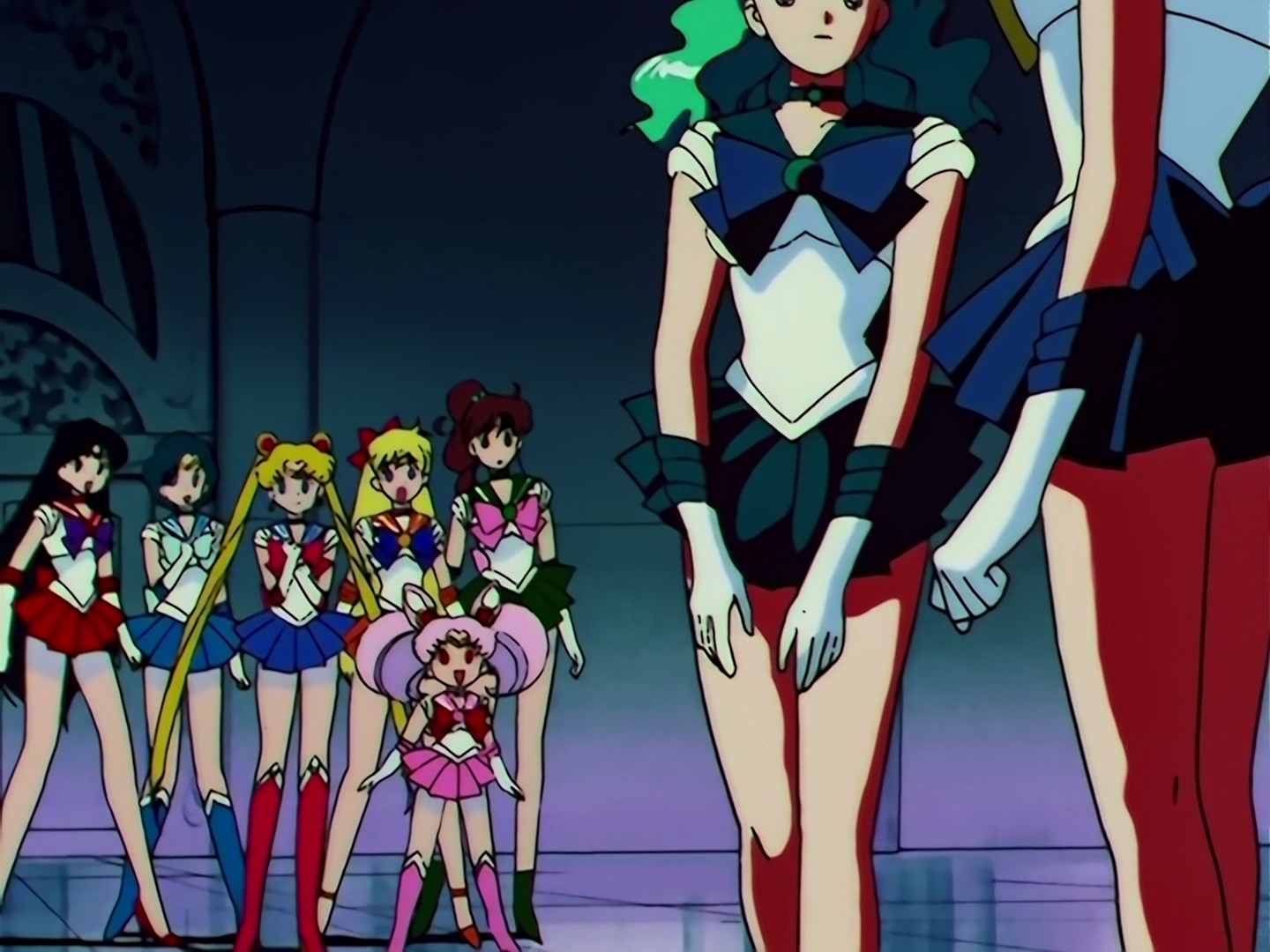 Nad leżącymi na podłodze Sailor Uranus i Sailor Neptune i unoszącymi się nad nimi Talizmanami stoją Usagi i pozostałe cztery wojowniczki. Sailor Uranus jest jeszcze przytomna, a Usagi pyta się jej, co zrobić, aby umieścić z powrotem Czyste
