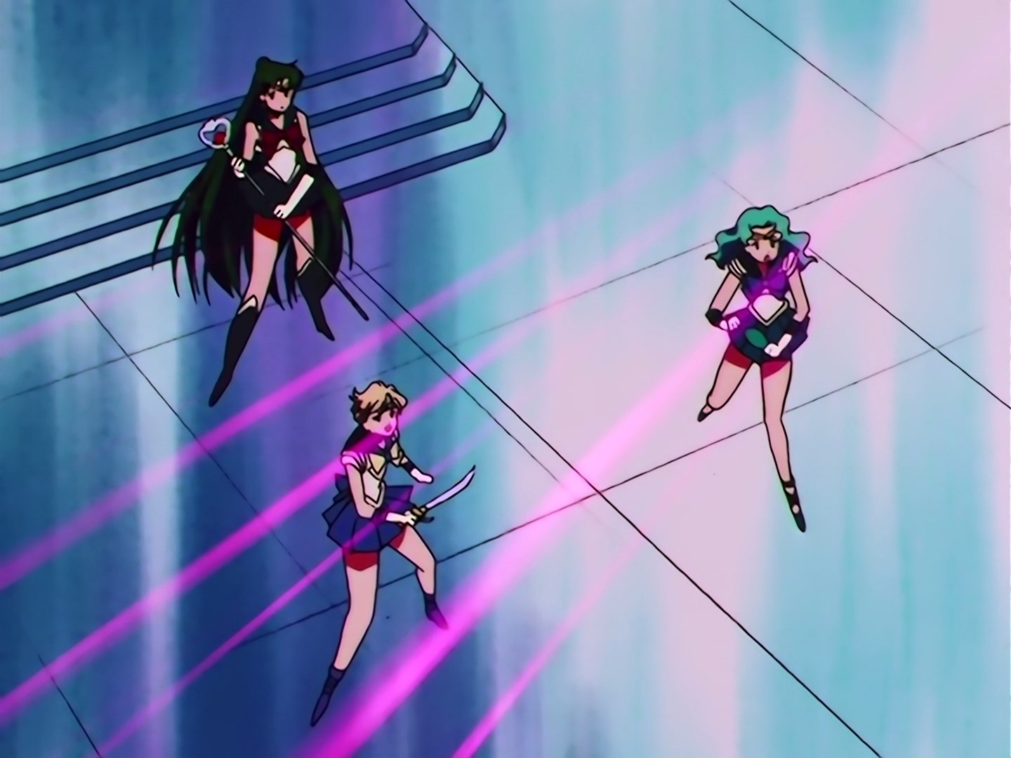 i odlatują od Eudial. Wszystkie trzy Talizmany ustawiają się w trójkącie, a następnie diadem na czole Sailor Pluto znika, a w jego miejscu pojawia się znak jej planety. To samo dzieje się z Sailor Uranus i Sailor Neptune, których pilnuje