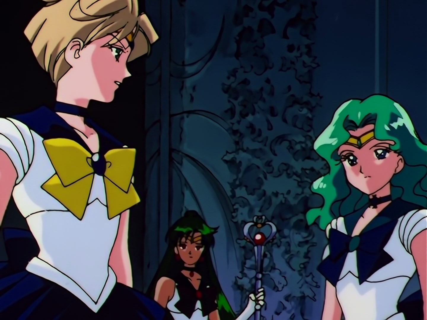 Sailor Mars klęczy przy Sailor Uranus i przykłada ucho do jej klatki piersiowej. Chwilę później podnosi głowę i oświadcza, że słyszy słabe bicie serca. Sailor Jupiter zastanawia się, jak mogą zamienić Talizmany z powrotem w Czyste