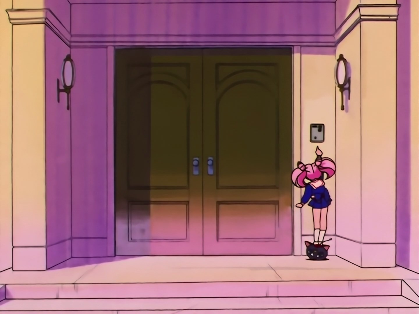 Chibiusa stoi pod drzwiami domu Hotaru i próbuje dosięgnąć dzwonka, stojąc na Lunie P. W końcu udaje jej się zadzwonić, ale chwilę później spada na ziemię. Drzwi uchylają się, a przez szparę wygląda Kaori. Chibiusa pyta się, czy
