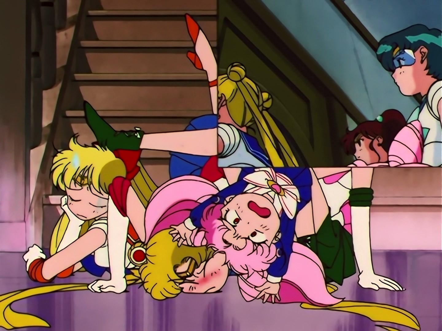 Hotaru próbuje wciągnąć Chibiusę do góry, ale Chibiusa mówi, że nie będzie jej mieć za złe, jeśli nie uda jej się wciągnąć na górę.