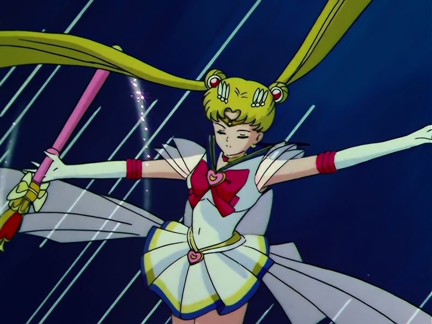 zatopiona była Sailor Moon i uwalnia ją. Wojowniczka przemienia się za pomocą Świętego Graala w Super Sailor Moon i stosuje atak Rainbow Moon Heartache.
