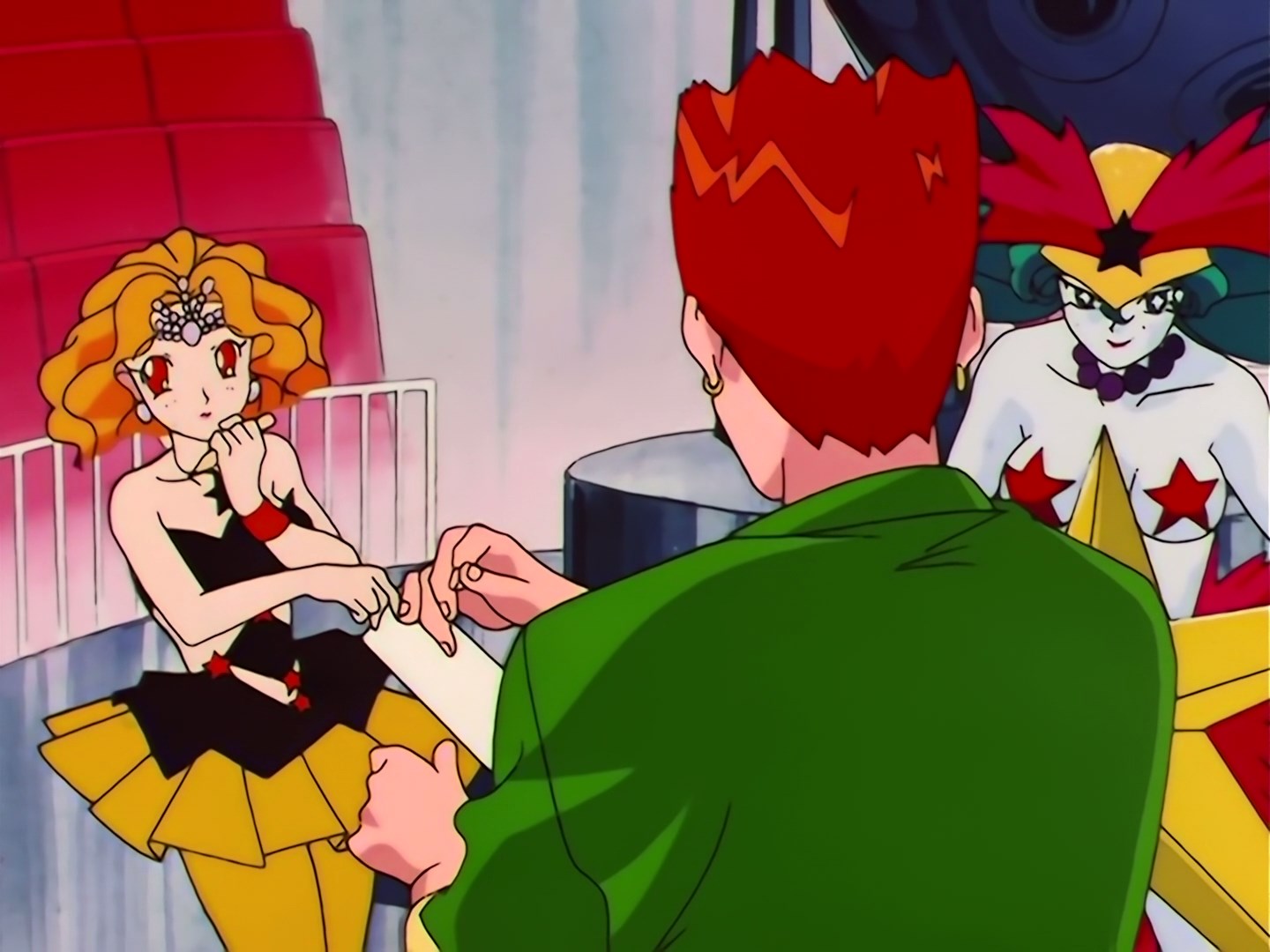 na widowni znajdują się również Haruka, Michiru i Setsuna, które dobrze wiedzą, że w pomieszczeniu znajduje się Mimete. Uważają, że prawdopodobnie prowadzący jest jej kolejnym celem. Dostrzegają również siedzące na widowni pozostałe