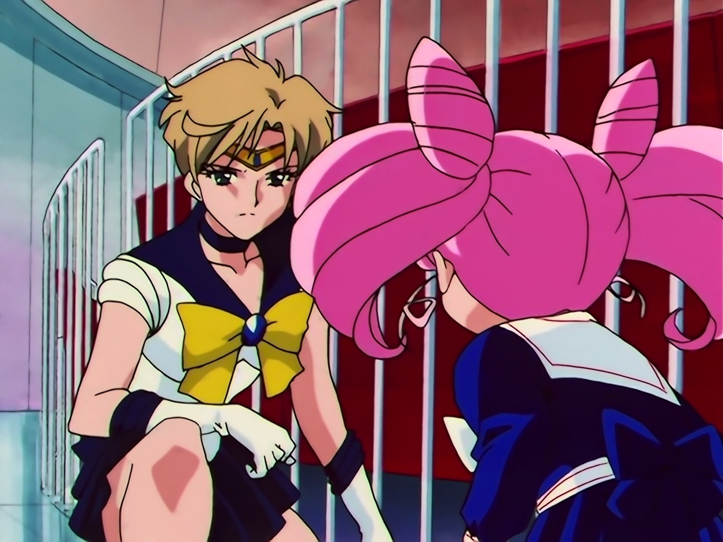 ale na jej drodze staje Sailor Uranus, która prosi ją, aby chwilę zaczekały i zobaczyły, co stanie się z Hotaru. Chibiusa jednak martwi się o swoją przyjaciółkę, a w międzyczasie do sali wkraczają wojowniczki i wygłaszają przemowę.