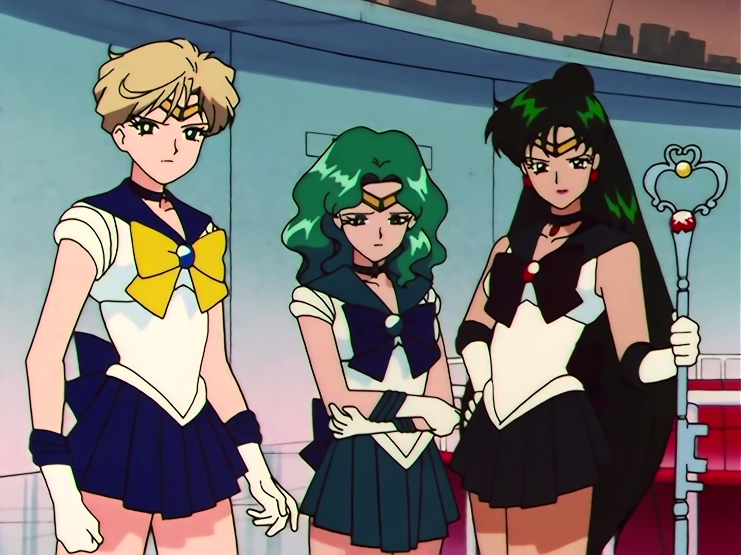 otaczają dziewczyny, a Sailor Uranus, Sailor Neptune i Sailor Pluto domagają się, aby pozostałe wojowniczki nie przeszkadzały im w zabiciu Hotaru, gdyż jest ona wojowniczką zniszczenia, Sailor Saturn, której przebudzenie się oznacza