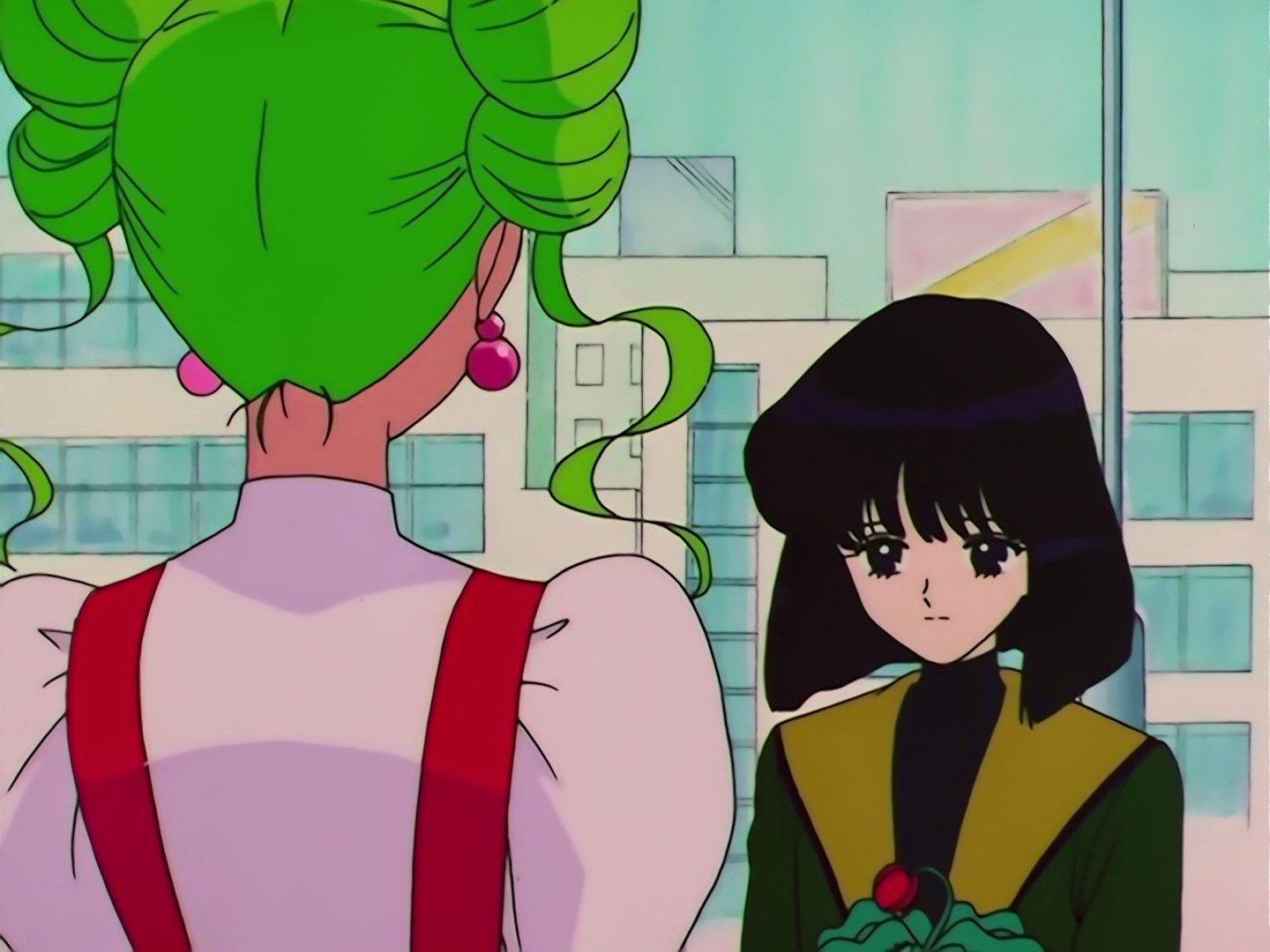 sobie, że nie mogła jej pomóc Hotaru. Pod dom Usagi przychodzi Setsuna i wita się z nimi. Kiedy zauważa, że Chibiusa trzyma w rękach doniczkę z kwiatem Tellun, wytrąca ją jej z rąk. Chibiusa jest zła i dodaje, że był to prezent od