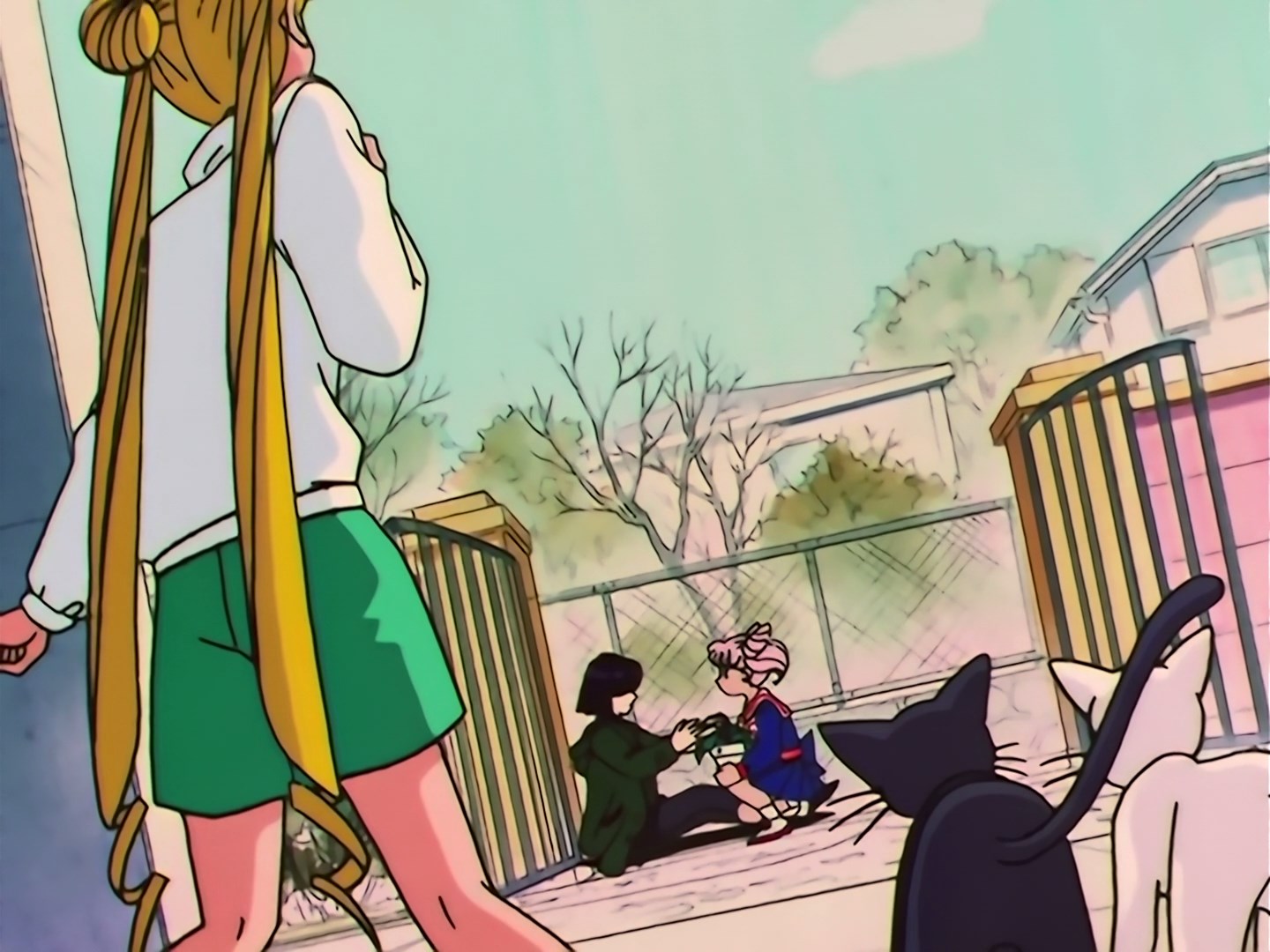 Chibiusa biegnie ulicą, a kawałek za nią biegną Usagi i koty. Usagi próbuje ją dogonić i zastanawia się, dokąd Chibiusa się tak spieszy, ale dziewczynka ucieka jej, a Usagi zatrzymuje się, aby odpocząć. Luna pyta się Usagi, czy