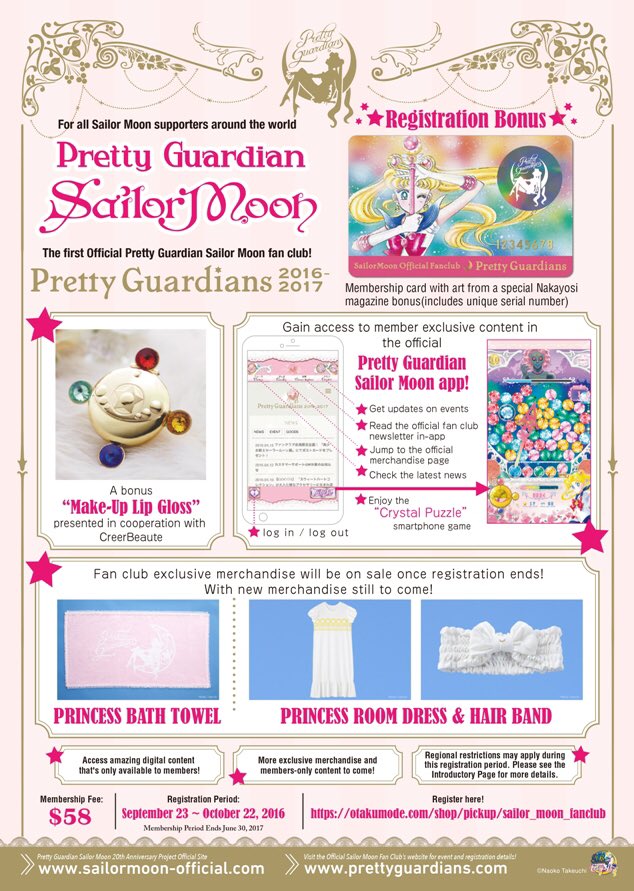 W pierwszym roku działania fanklubu członkowie otrzymali kartę członkowską z rysunkiem Sailor Moon i indywidualnym numerem oraz błyszczyk do ust w formie Henshin Brooch. Zapisy były przyjmowane w dniach od 10 kwietnia do 30 czerwca 2016. Okres pierwszego roku kończył się 30 czerwca 2017, a opłata członkowska wynosiła 5940 jenów (ok. 205 zł). Do 31 marca 2016 można też było wykupić członkostwo razem z biletem na event inauguracyjny w cenie 9180 jenów (ok. 321 zł).