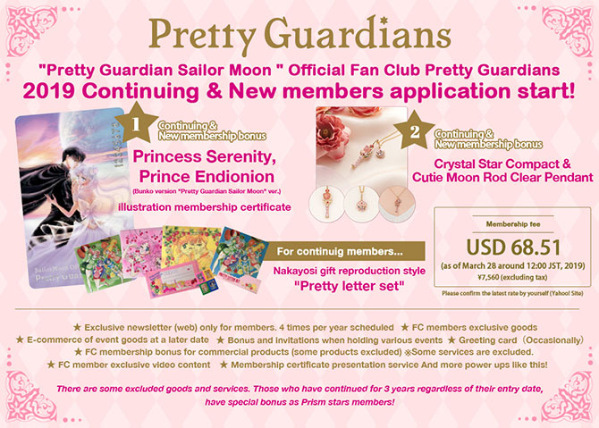 Osoby, które się zapisywały pierwszy raz lub przedłużały członkostwo, otrzymały kartę członkowską z Nową Królową Serenity oraz zestaw zawieszek zawierający Cosmic Heart Compact, Cutie Moon Rod, Pink Moon Stick oraz głowę Luny. Osoby przedłużające członkostwo otrzymały dodatkowo papeterię, która jest reprodukcją dodatku do magazynu Nakayoshi na czerwiec 1993 roku. Osoby, które przedłużały członkostwo na trzeci lub piąty rok, otrzymały certyfikat członkostwa, przypinkę oraz specjalne bonusy. Członkostwo na kolejny rok kosztowało 6050 jenów (ok. 217 zł) lub 55,40 dolarów (ok. 218 zł) + koszty wysyłki dla zagranicznych fanklubowiczów.