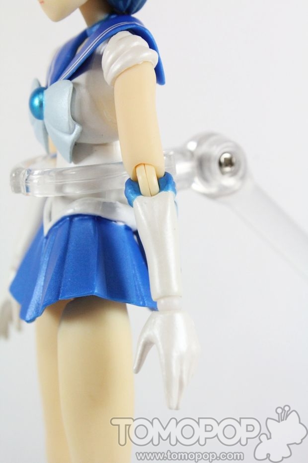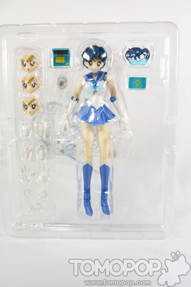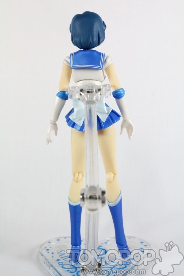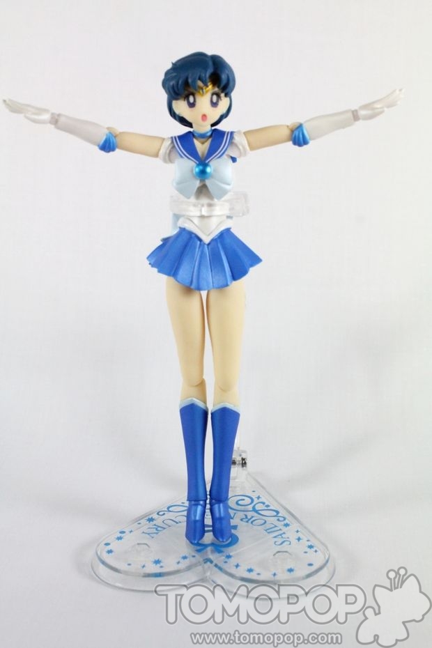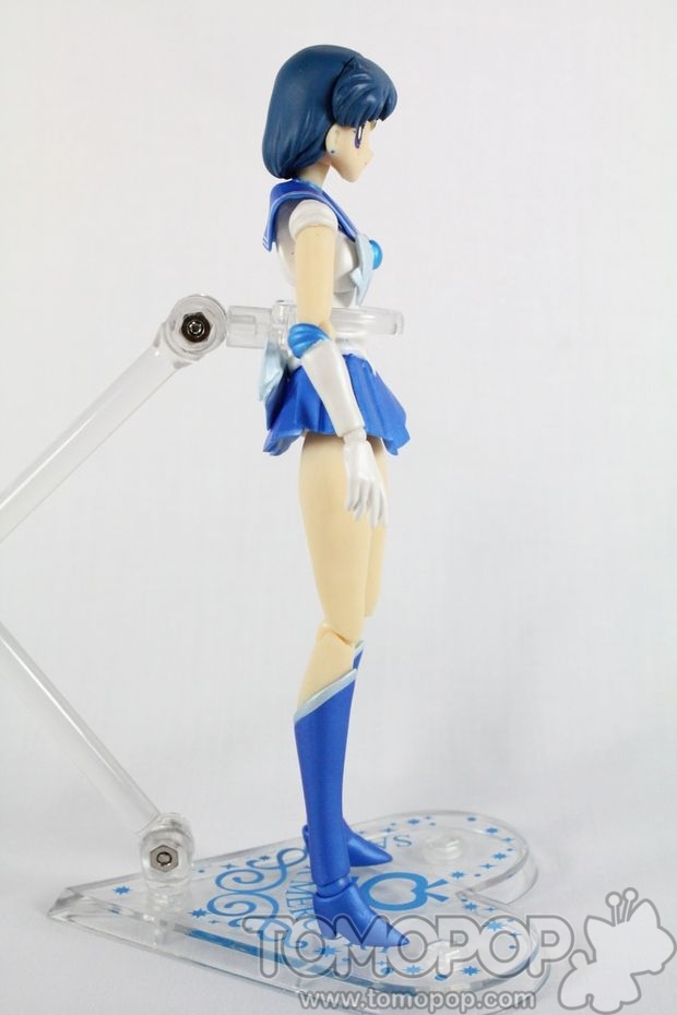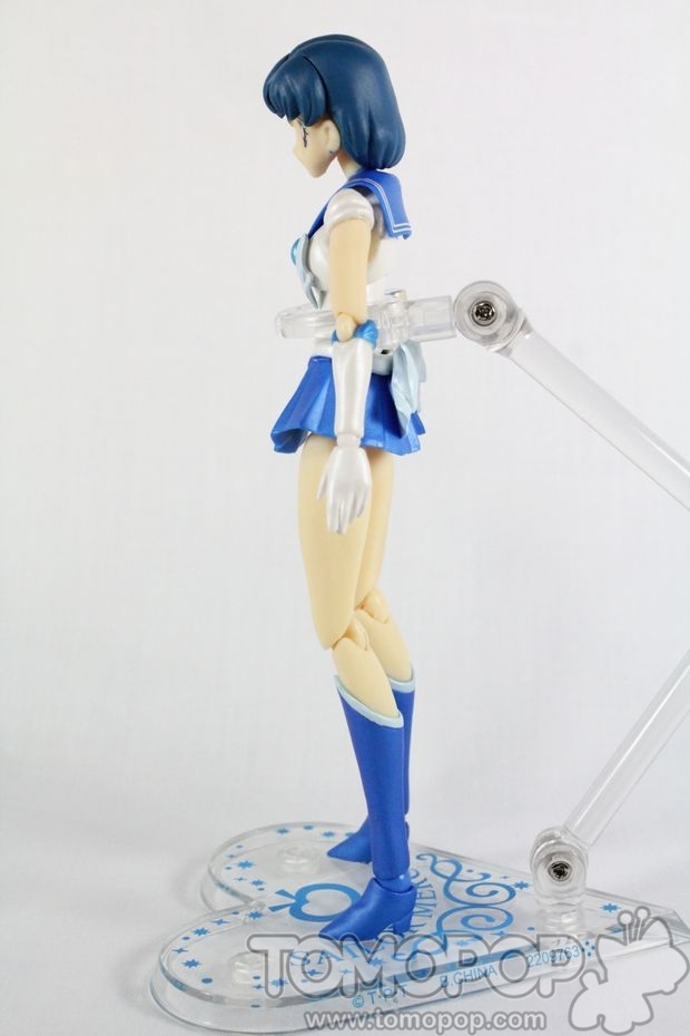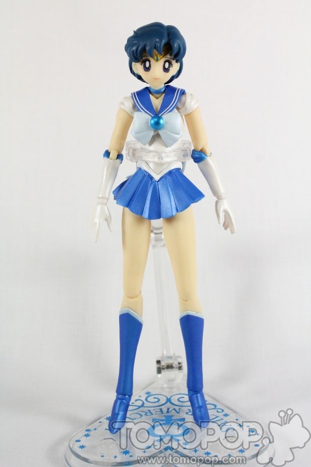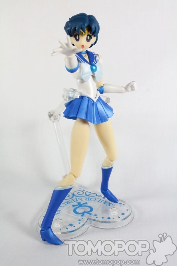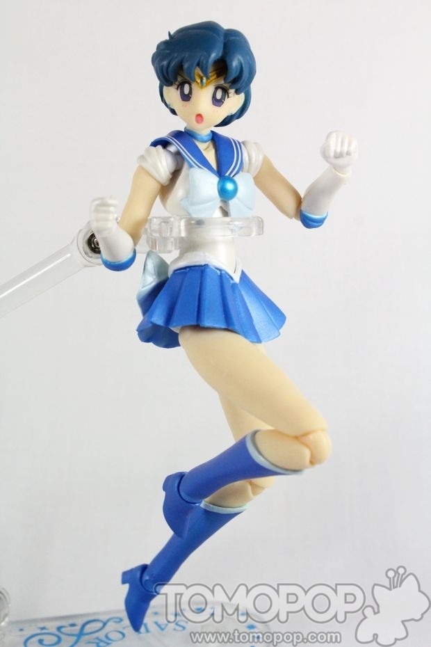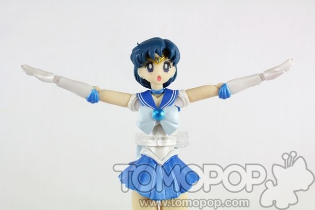 Jeśli chodzi o samą figurkę Sailor Mercury, to jest dobrze wykonana i pomalowana. Niebieska i granatowa farba mają lekko połyskujący odcień, co w świetle daje ciekawe efekty. Możliwości ustawienia figurki są dosyć spore, ruchome elementy to głowa, której można również zmieniać twarz, gogli nie zakłada się oddzielnie, ale również są oddzielną wymienną twarzą, ręce i nogi są zginane w 3 miejscach, a dłonie można wymieniać, regulować można również pas i miejsce pod biustem. Złączki do dłoni są nieco inne, więc nie można ich wymieniać z figurką Sailor Moon. W pasie można rozłożyć figurkę na pół. Spódniczka, ze względu na duży zasięg ruchomości nóg, jest wykonana z bardziej gumowego tworzywa, dzięki czemu można ją odginać i złożona jest z dwóch elementów, przodu i tyłu, które po bokach nachodzą na siebie. Dzięki temu przy szerokim rozstawieniu nóg spódniczka może zwiększyć swój obwód, ale nie będzie widać pęknięcia między częściami. Jedynym mankamentem tej figurki jest to, że fryzura, mimo że krótka, uniemożliwia odgięcie jej do tyłu, gdyż włosy obierają się o kołnierzyk.