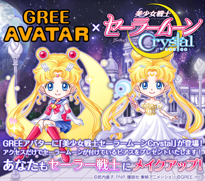 Od 1 do 30 kwietnia 2015 postacie z Sailor Moon Crystal pojawiły się w grze Gree Avatar i można ich było używać jako swoich avatarów. Firma świętowała swoje 20-lecie i z tej okazji pojawiła się ta współpraca. Dostępne były awatary inner senshi. Od 3 kwietnia do 25 maja 2015 dostępne były różne przedmioty z Sailor Moon Crystal, jak suknia Księżniczki Serenity, mundurek Usagi, Luna i Chibiusa.