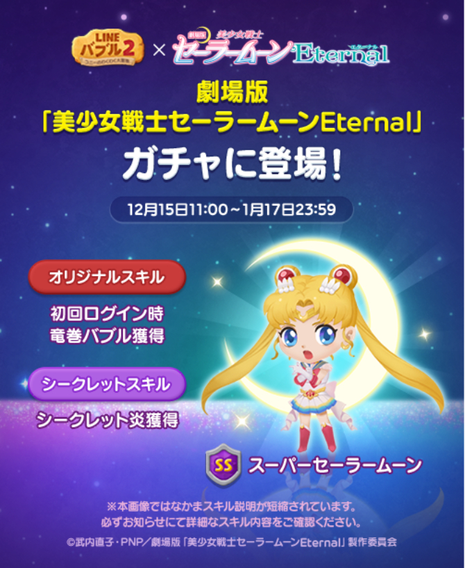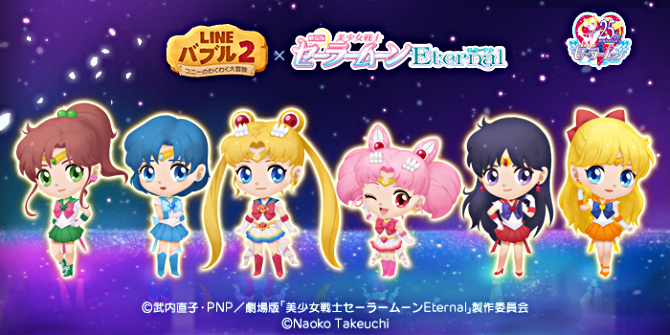 Sailor Moon Eternal pojawiło się czasowo w grze LINE Bubble 2. Można było zdobyć wszystkie inner senshi oraz Sailor Chibi Moon. Poszczególne postacie były do zebrania w różnych terminach, Super Sailor Moon była dostępna przez cały okres współpracy, Chibi Moon była dostępna od 15 do 20 grudnia 2020, Venus od 18 do 25 grudnia 2020, Jupiter od 24 do 29 grudnia 2020, Mercury od 6 do 10 stycznia 2021, a Mars od 11 do 14 stycznia 2021. Współpraca trwała od 15 grudnia 2020 do 17 stycznia 2021.