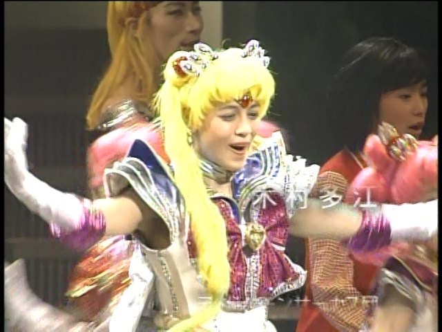 大山アンザ, 森野文子, 梅宮亜須加,佐田真理恵, 征矢千鶴, 望月祐多, 竹中夏海 lub 白井珠希ディア*, 笠原竜司, 木村多江, 田村月子 Ooyama Anza, Morino Ayako, Umemiya Asuka, Sada Marie, Soya Chizuru, Yuuta Mochizuki, Takenaka Natsumi lub Shirai Tamaki Dia*, Kasahara Ryuuji, Kimura Tae, Tamura Tsukiko Usagi, Ami, Rei, Makoto, Minako, Chibiusa, Mamoru, Tigers Eye, Hawks Eye, Fish Eye *w zależności od przedstawienia występowała inna aktorka |