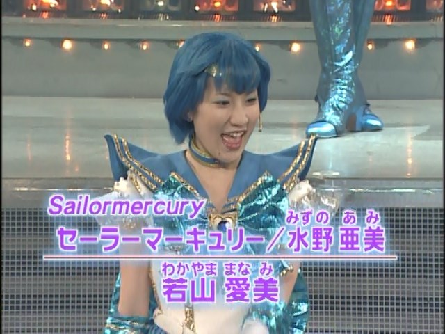 黒木マリナ, 若山愛美, かわさき愛子, 渡辺舞, 渋谷桃子, 内田亜紗子, 藺波知子, 穂坂優子, 飯塚由衣, 秋山千夏, 中山旦子, 多部未華子 Kuroki Marina, Wakayama Manami, Kawasaki Aiko, Watanabe Mai, Shibuya Momoko, Uchida Asako, Inami Tomoko, Hosaka Yuuko, Iizuka Yui, Akiyama Chinatsu, Nakayama Akiko, Tabe Mikako Sailor Moon, Sailor Mercury, Sailor Mars, Sailor Jupiter, Sailor Venus, Sailor Uranus, Sailor Neptune, Sailor Pluto, Sailor Saturn, Sailor Star Fighter, Sailor Star Maker, Sailor Star Healer |